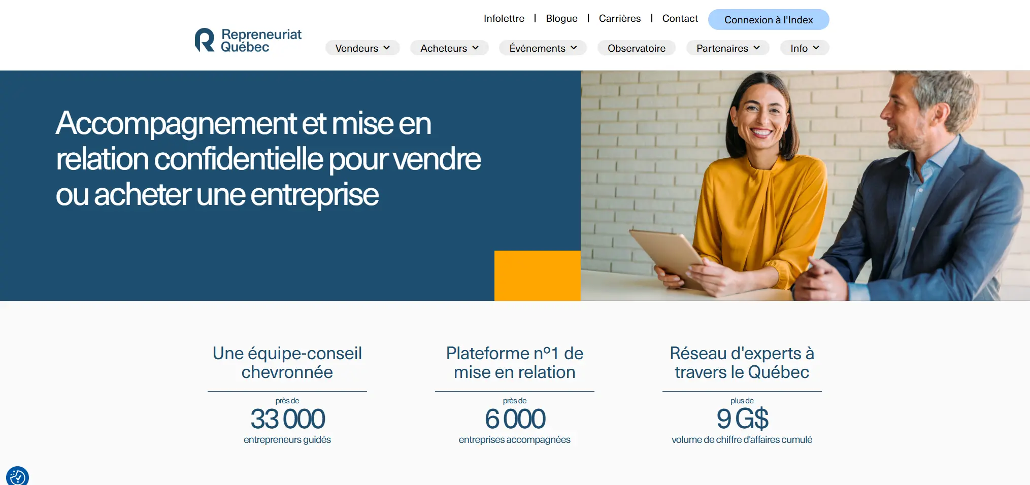 Repreneuriat Québec est le chef de file du repreneuriat au Québec. Il facilite le transfert d’entreprises québécoises en simplifiant la mise en relation des acheteurs et vendeurs d’entreprises et en les accompagnant dans leurs démarches.