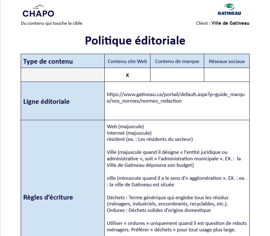 Les services des communications et le SEMR de la Ville de Gatineau ont entrepris une révision du contenu de la section particulièrement volumineuse : 10 pages, 28 sous-sections et plus de 8 500 mots.